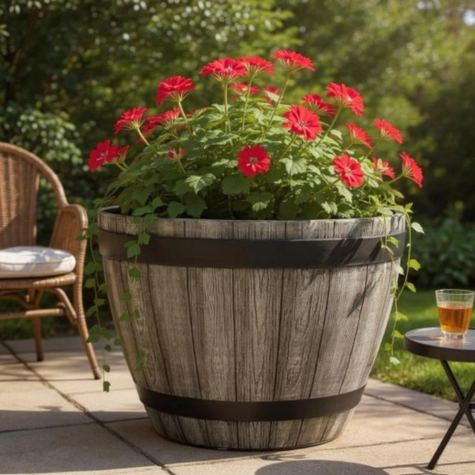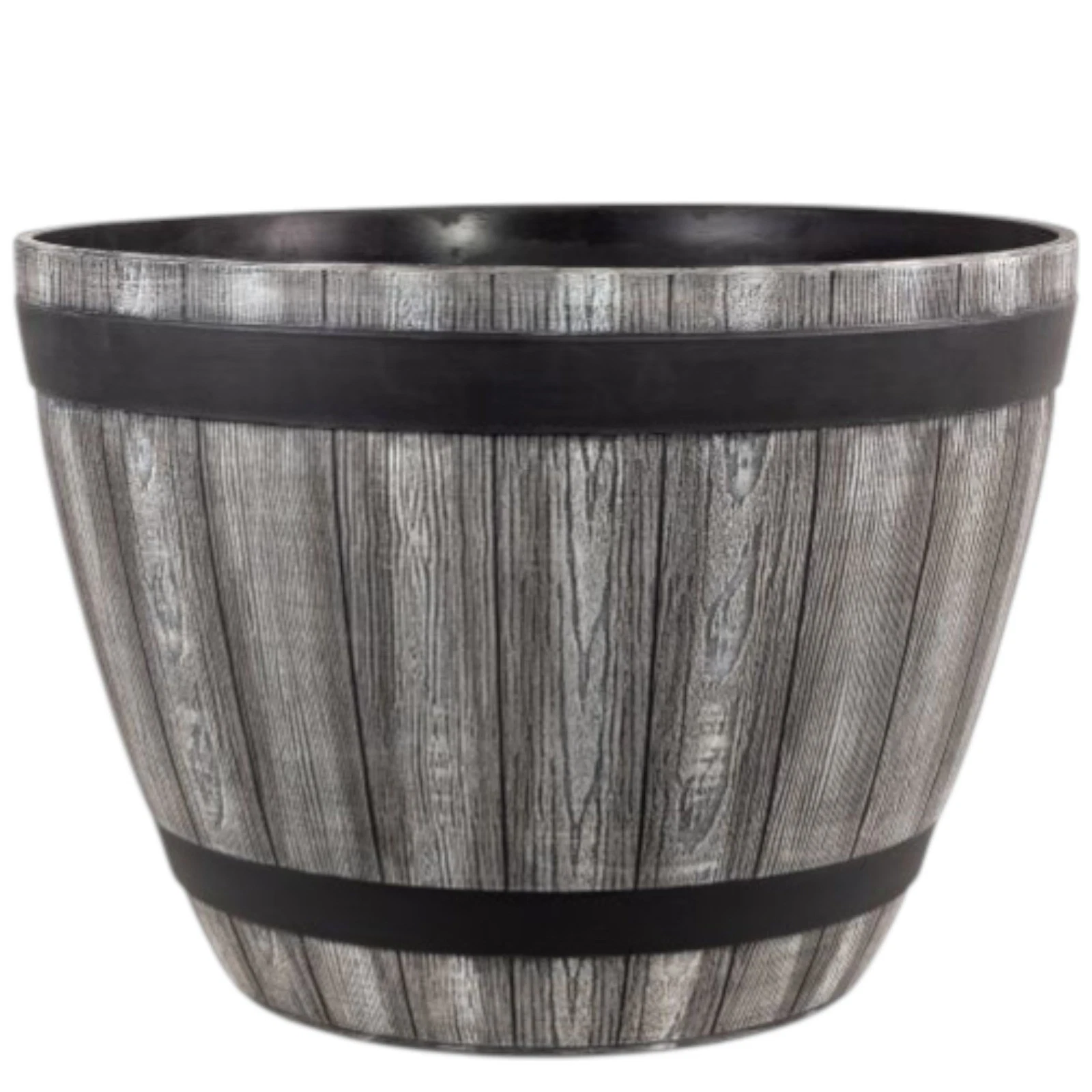 • Rustic Wood Look: Realistic grey wood-grain effect with black hoops gives the appearance of a traditional barrel planter.